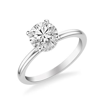 Anillo tradicional solitario, diamante central sostenido por canasta con 4 uñas y halo oculta en engaste pave frances.